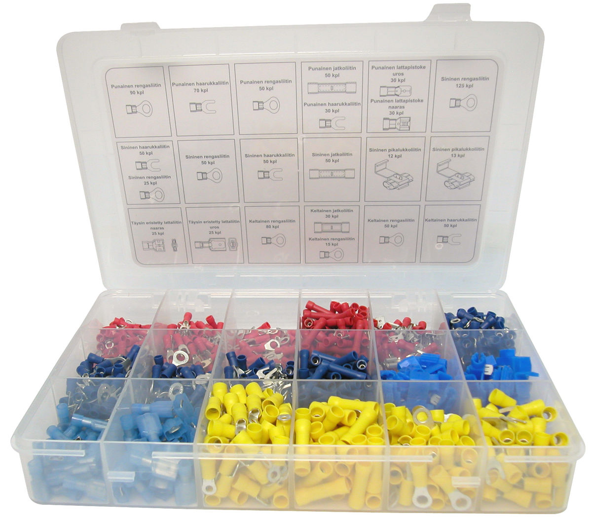 Sisältö: - rengasliittimet 485 kpl - haarukkaliittimet 250 kpl - jatkoliittimet 130 kpl - täysin eristetyt lattaliittimet 25 kpl uros, 25 kpl naaras - lattapistokkeet 30 kpl uros, 30 kpl naaras -... Lue lisää