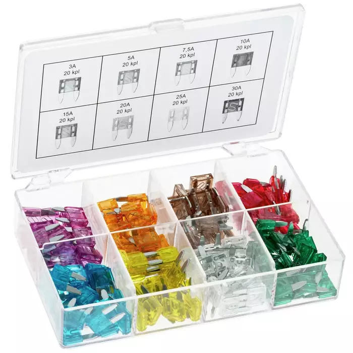 Kattava sulakelajitelma Mini 160kpl - Näppärässä muovirasiassa Sisältää 160 kpl mini-lattasulakkeita: 20 kpl 3 A 20 kpl 5 A 20 kpl 7,5 A 20 kpl 10 A 20 kpl 15 A 20 kpl 20 A 20 kpl 25 A 20 kpl... Lue lisää