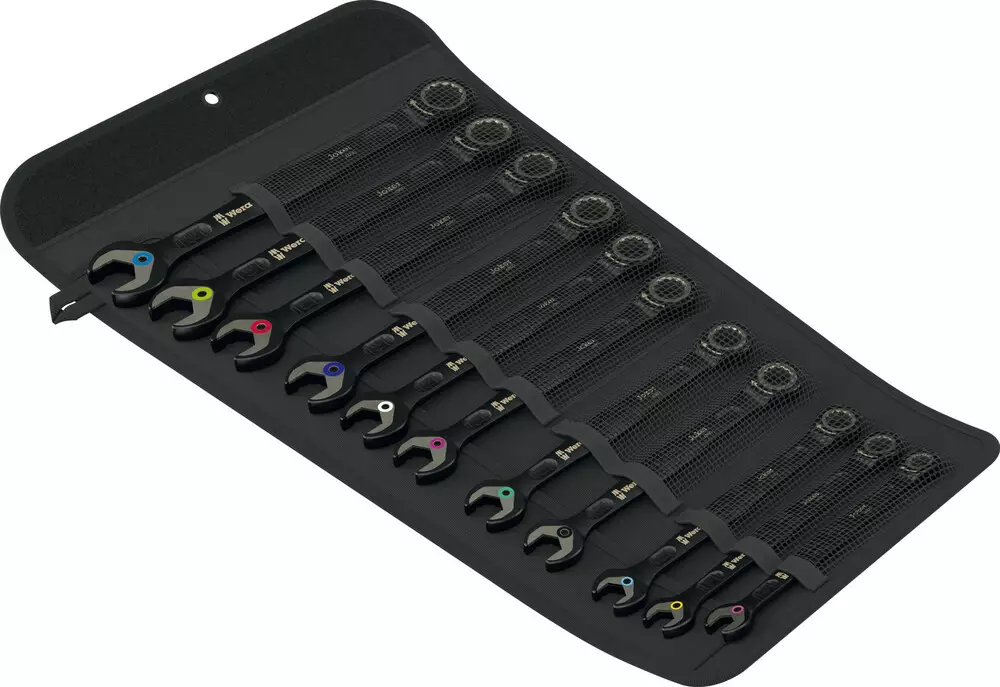 11-osainen räikkälenkkiavainsarja Weralta. Kuusiokantaisille ruuvinpäille ja muttereille. Kiintoavaimen metallilevyssä on pitotoiminto, joka pienentää ruuvien ja muttereiden häviämisriskiä. Kiintoavaimen vaihdettava metallilevy puree ruuveihin ja muttereihin erittäin kovilla hampaillaan ja vähentää poisluiskahtamisen vaaraa. Integroitu päätyvastus estää poisluiskahtamista ruuvin kannasta alaspäin ja mahdollistaa korkean vääntömomentin. Kaksinkertainen kuusikulmainen geometria varmistaa, että työkalu pysyy kiinni ruuvissa tai mutterissa, ja siten vähentää poisluiskahtamisen riskiä. Kiintoavainpään vain 30°:n palautuskulman ansiosta avainta ei tarvitse kääntää aikaa vievästi ruuvattaessa. Lenkkipuolen räikkämekanismi mahdollistaa erityisen hienon 80 hampaan hammastuksensa ansiosta joustavan käytön myös ahtaissa tiloissa. Erityinen taottu geometria takaa suuren vääntömomentin voimansiirron ja suuren taivutusjäykkyyden. Valmistettu suorituskykyisestä kromimolybdeeniteräksestä, jossa laadukas ja luja mattamustakromattu pinta. Take it easy -värikoodausjärjestelmä: värikoodit kokojen mukaan. Lujatekoisessa rullataskussa.