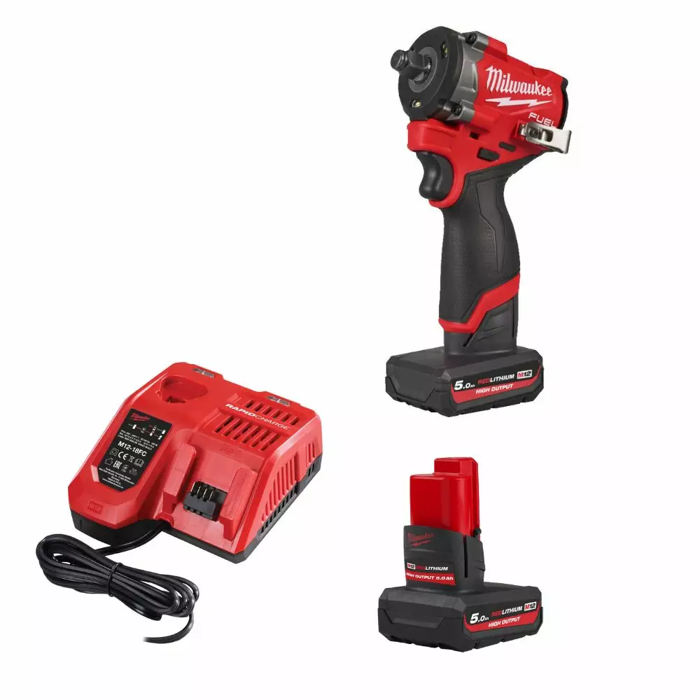 Milwaukee M12 FUEL ½" FCIWF12G3-502 kompakti iskevä mutterinväännin kitkarenkaalla, kahdella 5 Ah High Output akulla ja M12-18 FC pikalaturilla
