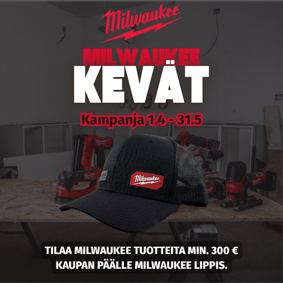 Meidän kampanja = Tilaa vähintään 300 € arvoisia Milwaukeen tuotteita, saat kaupan päälle Milwaukee x Työkaluässä lippiksen. Lisäämme automaattisesti tilaukselle lippiksen, mikäli 300 € ostoraja täyttyy.