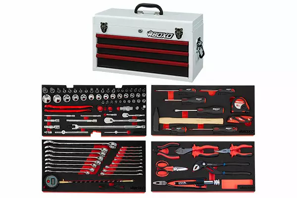 Moottoripyörille suunniteltu 103-osainen työkalusarja työkalulaatikostossa. Avattava kansi ja kolme vetolaatikkoa keskuslukituksella.