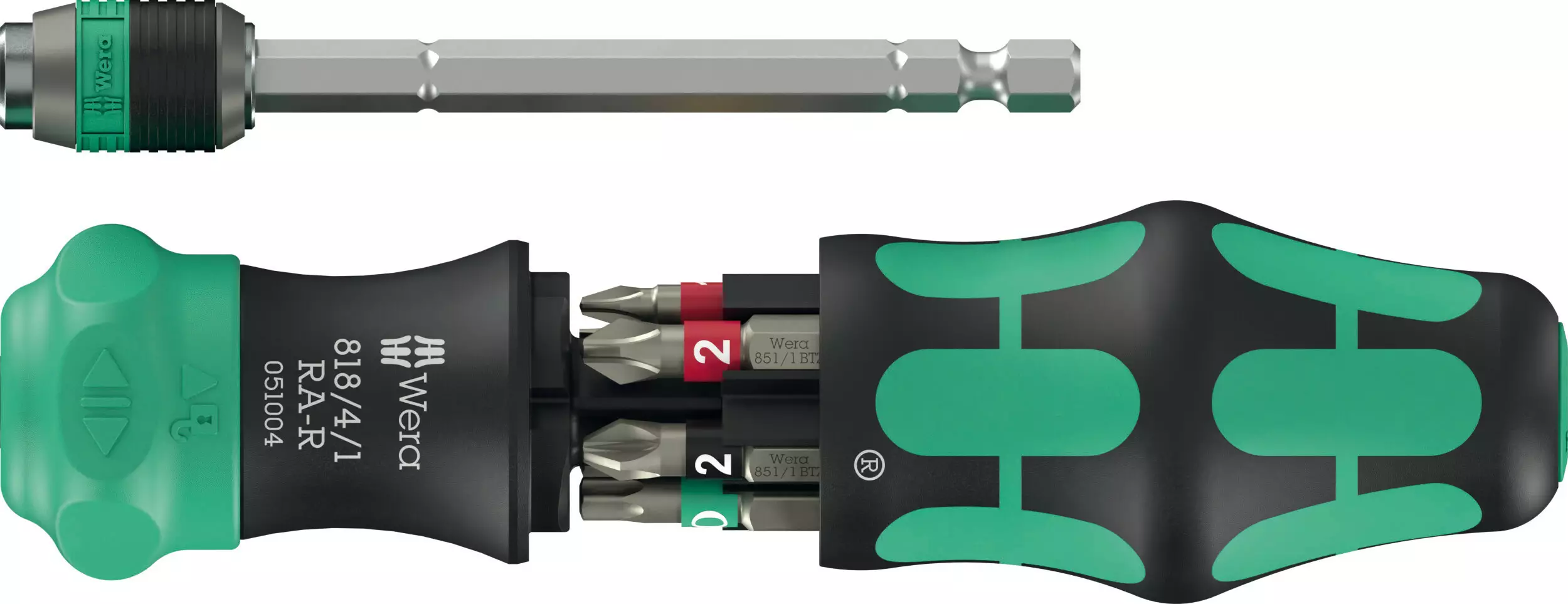 Kraftform-kahva, johon on integroitu lipas kuudelle Bits-kärjelle; teleskooppiterällä; 1/4" Bits-kärjille. Kahvaan on integroitu hienolla hammastuksella varustettu räikkä, joka takaa nopean työskentelyn. Ruuvaussuunnan vaihto on intuitiivista: kun rengassäädin käännetään oikealle, ruuvataan oikealle, ja kun rengassäädin käännetään vasemmalle, ruuvataan vasemmalle. Tarkkoja töitä varten räikkämekanismi voidaan kytkeä pois käytöstä 0-asennon avulla. Kahvaan upotettava teleskooppiterä ja Rapidaptor-pikaistukka mahdollistavat nopean manuaalisen ruuvaamisen myös ahtaissa tiloissa, kun terä on sisään painettuna. Terä voidaan vetää ulos yksinkertaisesti käyttämällä lukituskaulusta. Työkalua voidaan nyt käyttää tavallisen ruuvitaltan tavoin. Teleskooppiterä voidaan irrottaa, ja sitä voidaan käyttää konepitimenä, tai se voidaan palauttaa alkuperäiseen asentoon. Bits-kärkipitimen Rapidaptor-teknologia takaa nopeat Bits-kärkien vaihdot. Mukana 6 pitkäikäistä ja sitkeäksi karkaistua BiTorsion-Bits-kärkeä yleiskäyttöön; säilytys kahvaan integroidussa Bits-kärkilippaassa. 1/4" Bits-kärkipitimen vahva kestomagneetti pitää Bits-kärjen varmasti paikoillaan. Kaksikomponenttisen Kraftform-kahvan kovan ja pehmeän alueen yhdistelmä mahdollistaa hyvän otteen ja tarkan työskentelyn. Mukana lujatekoinen säilytystasku.