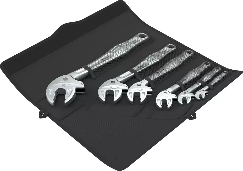6-osainen sarja. Itsesäätyvät Joker 6004 -kiintoavaimet räikkätoiminnolla. Portaattomasti liukuvien rinnakkaisten leukojen avulla voidaan korvata monta erikokoista kiintoavainta yhdellä. Metrisille (7,0-32,0 mm) ja tuumaisille (1?4"-1 1/4") kuusiokantaruuveille ja -muttereille. Avain säätyy automaattisesti asettaessasi sen kiinni kuusiokantamutteriin tai -ruuviin. Integroitu vipumekanismi kiinnittää kuusiokantaruuvin tai -mutterin tukevasti leukojen väliin, mikä vähentää merkittävästi poisluiskahtamisen ja vahinkojen riskiä. Räikkätoiminto takaa nopean ja sujuvan ruuvauksen ilman avaimen irrottamista ruuvista tai mutterista. Leukojen pienen hammastuksen ansiosta pystyimme toteuttamaan vain 30°:n palautuskulman. Poiketen perinteisistä pihdeistä, yksikahvainen rakenne yhdessä leukojen hammastuksen kanssa mahdollistaa työskentelyn myös ahtaissa paikoissa. Lujatekoisessa rullataskussa.