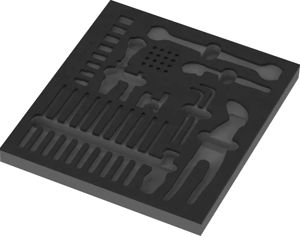 1 kestävä vaahtomuovisisus, ilman työkaluja; 2-värinen puuttuvien osien nopeaan tunnistamiseen; leveys x korkeus x syvyys: 344 x 30 x 392 mm; korvaava vaahtomuovisisus Wera-tuotteelle 9753; sopii Tool Rebel -työkaluvaunuihin.