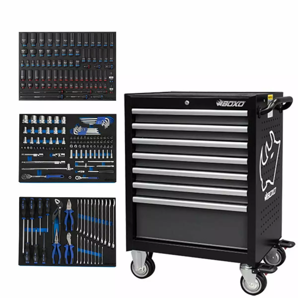 Tyylikäs, erittäin tukevarakenteinen Boxon työkaluvaunu 224 osaisella työkalusarjalla.