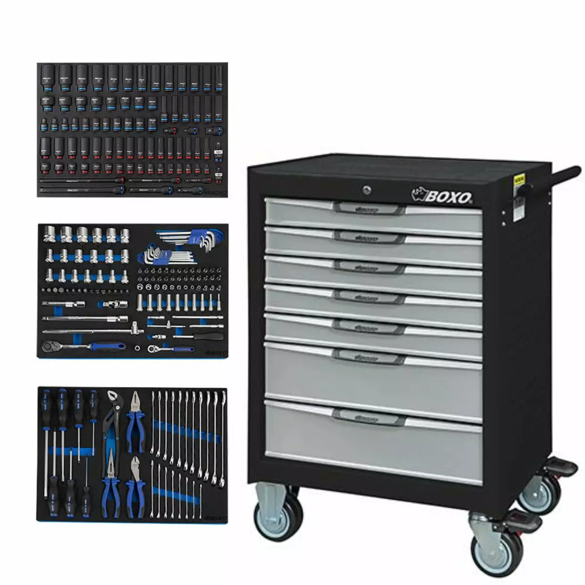 Tyylikäs ja jämerä Boxon laatikkojarrullinen työkaluvaunu 224 osaisella työkalusarjalla.