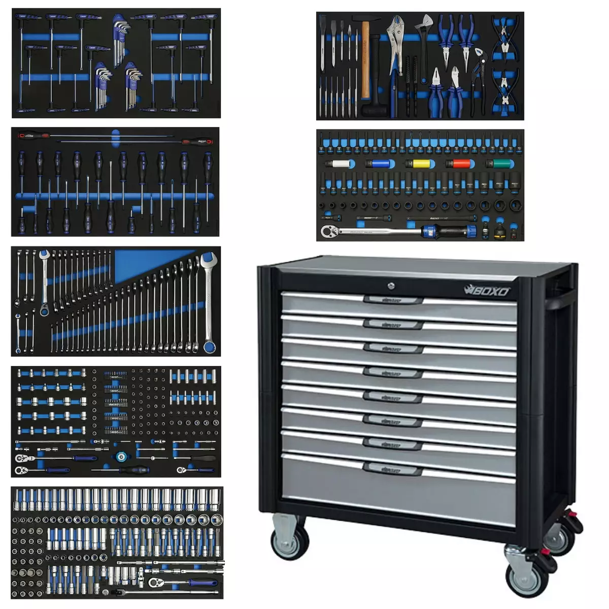 Työkaluvaunu kahdeksalla vetolaatikolla ja 518-osaisella työkalusarjalla. Kahdeksan kuulalaakeroitua vetolaatikkoa keskuslukituksella, vain yksi vetolaatikko aukeaa kerrallaan. Vaunun kulmissa törmäyssuojat ja päädyissä reikälevyseinät, joissa yleisimmin käytetty 9x38 mm reikäjako. Kansi ruostumatonta terästä. Laatikoiden vetokahvat pitävää kaksikomponenttimateriaalia. Vaunun alin vetolaatikko jää tyhjäksi omia työkaluja ja tarvikkeita varten. Alimman vetolaatikon mitat L 752 x S 397 x K 152 mm.