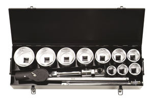 kromivanadiumterästä, kromipinnoite - 10 kpl 6-kulmaiset hylsyt 36 - 41 - 46 - 50 - 55 - 60 - 65 - 70 75 - 80 mm - 2 kpl jatkovarret 200 ja 400 mm - 1 kpl väännin 550 mm - 1 kpl räikkäpää 200... Lue lisää