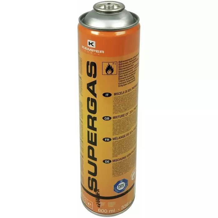 kierreventtiili (kierre 7/16") - propaani/butaani seos 35 % / 65 % - liekin lämpötila max. 1800°C - alin käyttölämpötila -15°C - nettopaino 336 g (600 ml)