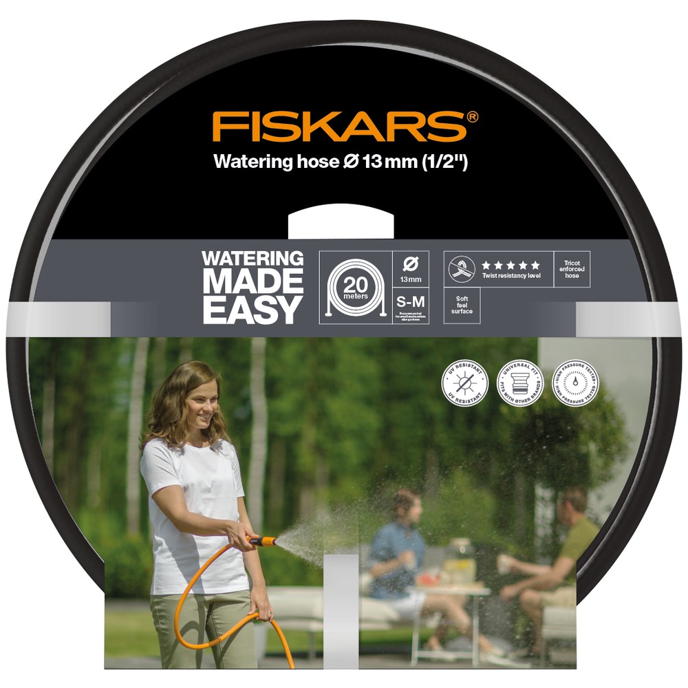 Fiskars kasteluletku Q5 - kevyt - UV-suojattu - korkeapainetestattu - kiertymätön - nylonpunoskerros takaa korkean laadun - pehmeä pinta - Ø 13 mm (1/2") - pituus 20 m