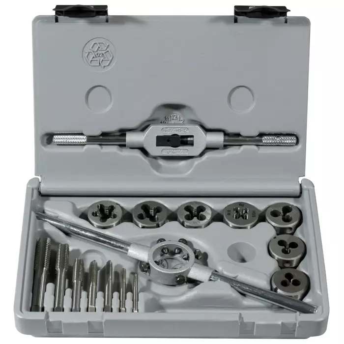HSS-G kierretyökalusarja - metrinen ISO-kierre DIN 13 Sisältää: - käsikierretapit: M3 - M4 - M5 - M6 - M8 - M10 - M12 - kierrepakat: M3 - M4 - M5 - M6 - M8 - M10 - M12 - tappiväännin -... Lue lisää