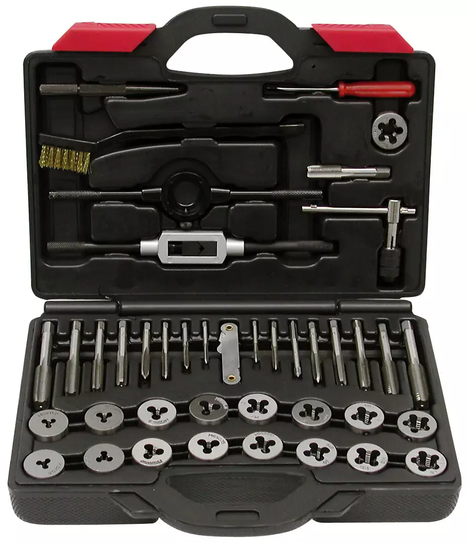 - kierrepakat 17 kpl: M3x0,5 - M3x0,6 - M4x0,7 - M4x0,75 - M5x0,8 - M5x0,9 - M6x0,75 - M6x1,0 - M7x0,75 - M7x1,0 - M8x1,0 - M8x1,25 - M10x1,25 - M10x1,5 - M12x1,5 - M12x1,75 - 1/8 NPT 27