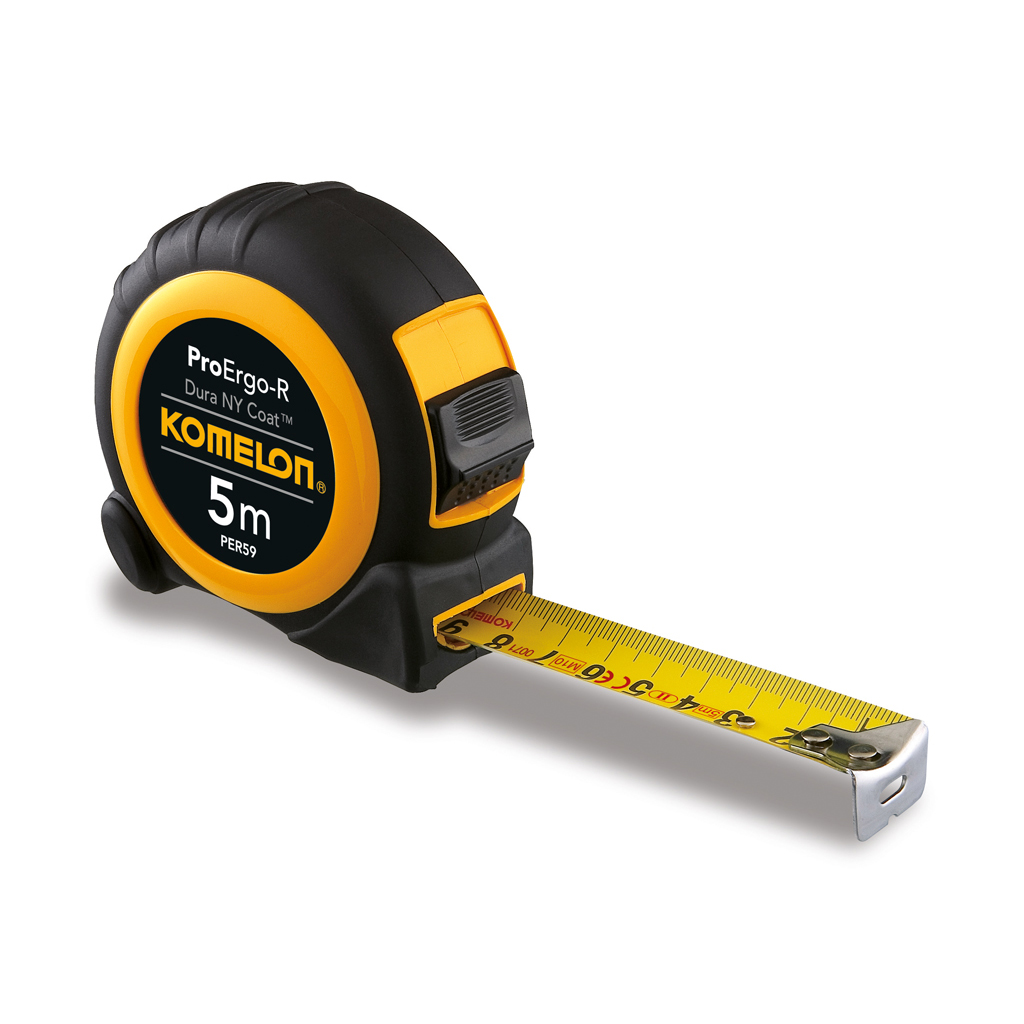 KOMELON Rullamitta ProErgo-R. Ergonomisesti muotoiltu kotelo. Kuminen iskusuoja. Nylonpinnoitettu nauha. Vahva nauhalukko.