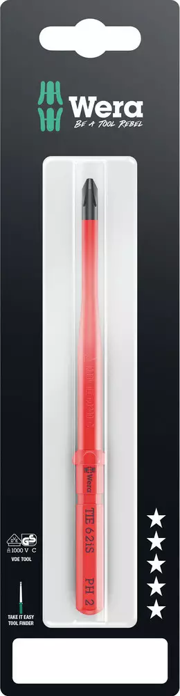 Käyttökohde: ristipääruuvit Phillips Terä: kavennettu terä integroidulla suojaeristeellä, minkä ansiosta päästään käsiksi syvällä oleviin PH-ruuveihin, testattu yksittäin standardin IEC 60900 mukaan Kiinnitys: 9 mm:n kuusiokanta, jossa viiste Malli: sinkkifosfaattipinnoite, Black Point -kärki, Take it easy -värikoodausjärjestelmä: värikoodit profiilien mukaan ja laseroitu kokomerkintä; kuusikantainen kierimisenesto poisvierimisen estämiseksi