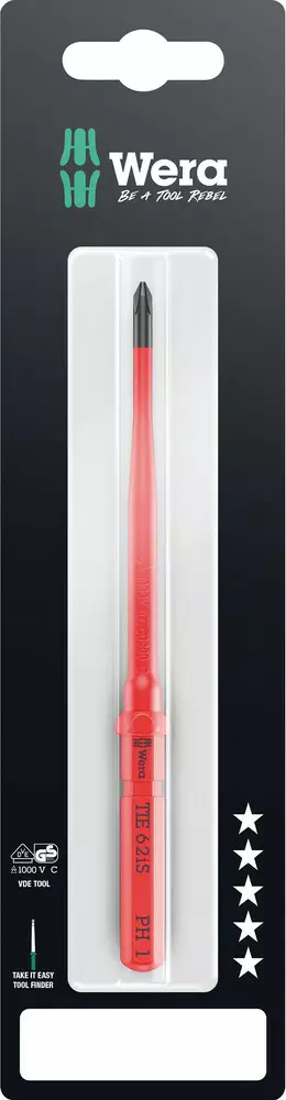 Käyttökohde: ristipääruuvit Phillips Terä: kavennettu terä integroidulla suojaeristeellä, minkä ansiosta päästään käsiksi syvällä oleviin PH-ruuveihin, testattu yksittäin standardin IEC 60900 mukaan Kiinnitys: 9 mm:n kuusiokanta, jossa viiste Malli: sinkkifosfaattipinnoite, Black Point -kärki, Take it easy -värikoodausjärjestelmä: värikoodit profiilien mukaan ja laseroitu kokomerkintä; kuusikantainen kierimisenesto poisvierimisen estämiseksi