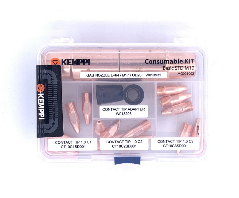 Kulutusosapaketti Basic STD M10, lanka 1.0mm, suutin Ø28 Paketin sisältö: - 5 kpl CT10C1SD001 VIRTASUUTIN 1.0 C1 STD M10 - 5 kpl CT10C2SD001 VIRTASUUTIN 1.0 C2 STD M10 - 5 kpl CT10C3SD001... Lue lisää