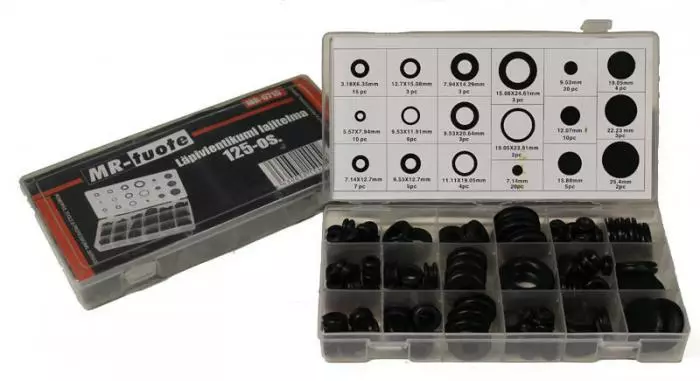 Läpivientikumi lajitelma 125-os. - Kattava valikoima läpivientikumeja muovirasiassa