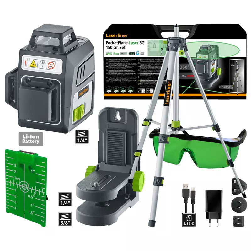 Toimitussisältö: PocketPlane-Laser 3G, USB-C latauskaapeli + verkkovirtalaite, 150 cm kolmijalka, laserkohdistustaulu, seinäteline, vihreät laserlasit, kuljetussalkku