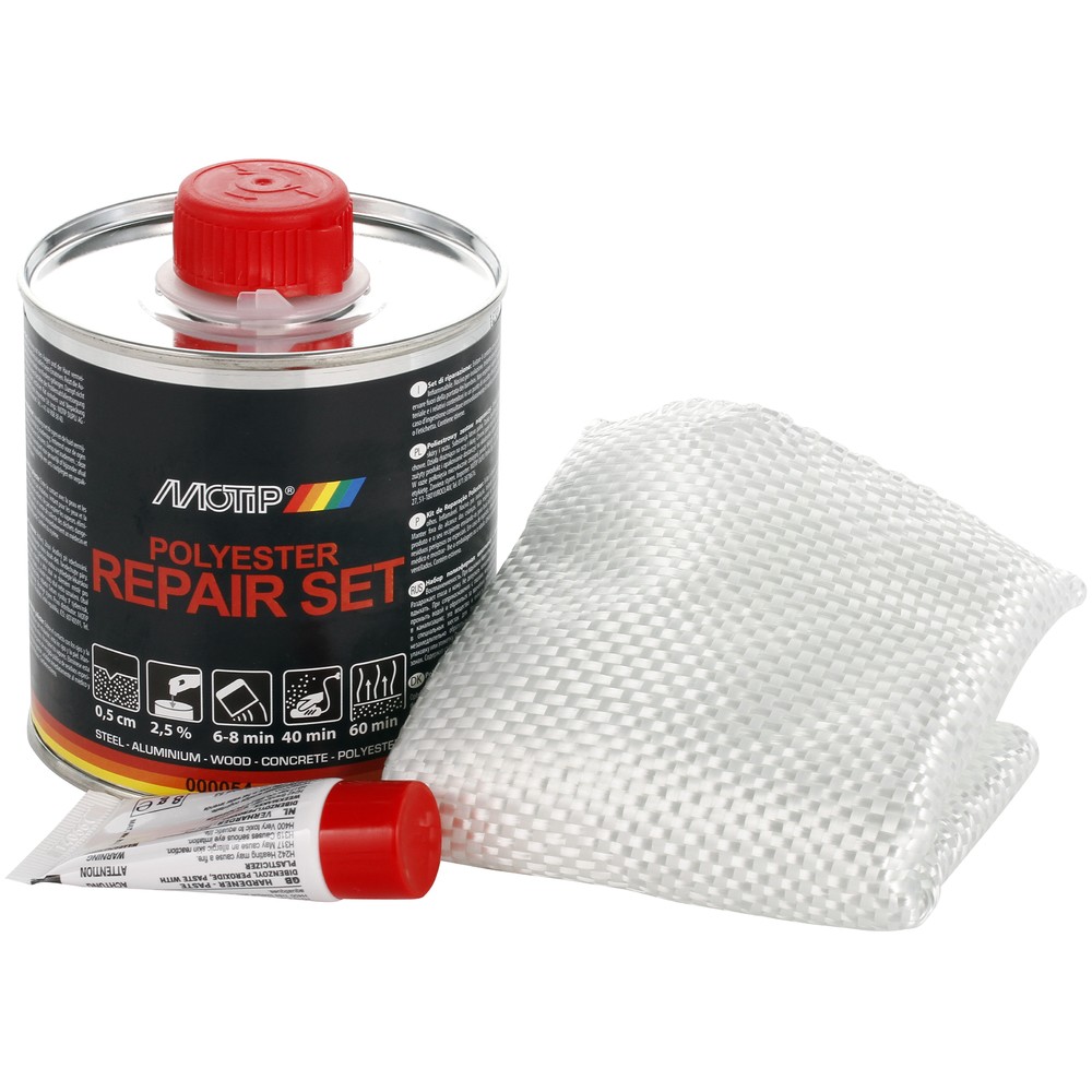 nestemäinen polyesterhartsi, kovettaja ja lasikuituinen verkko mukana - metallille, puulle, betonille ja lämpökovetetuille synteettisille aineille - huomattavien vahinkojen, kuten reikien ja... Lue lisää