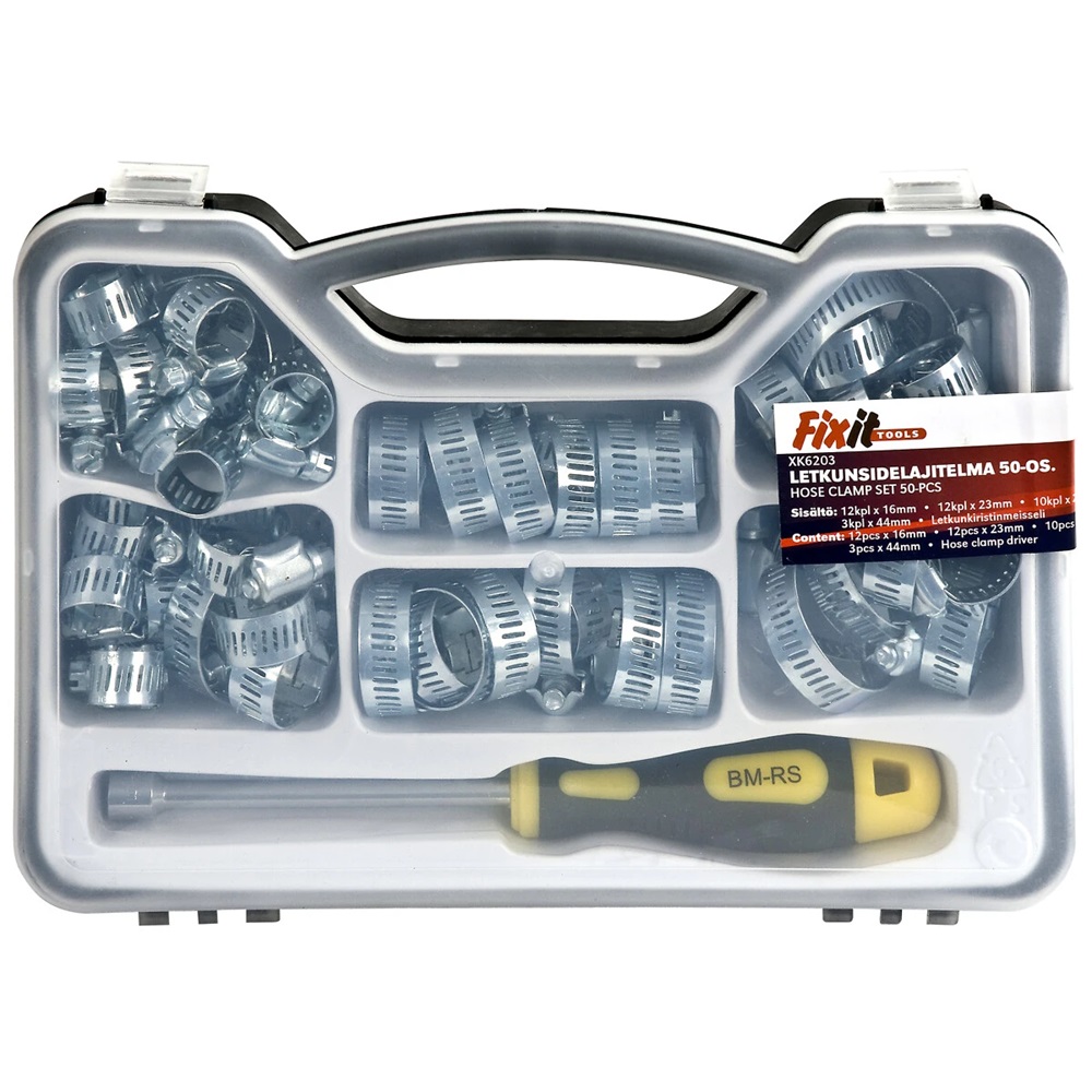 Tiedäthän sen tunteen, tarvitset yhden letkuklemmarin ja juuri se tietty koko on päässyt loppumaan -> ei muuta kuin työt seis ja kauppaan! Selätä ongelma tällä lajitelmalla, mukana kätevä kiristysmeisseli klemmareille!