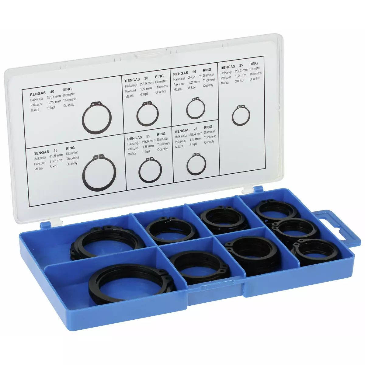 ulkopuolinen lukkorengaslajitelma 58-os. Sisältö: - rengas 45: Ø 41,5 mm / paksuus 1,75 mm / 5 kpl - rengas 40: Ø 37,0 mm / paksuus 1,75 mm / 5 kpl - rengas 32: Ø 29,6 mm / paksuus 1,5 mm / 6 kpl... Lue lisää