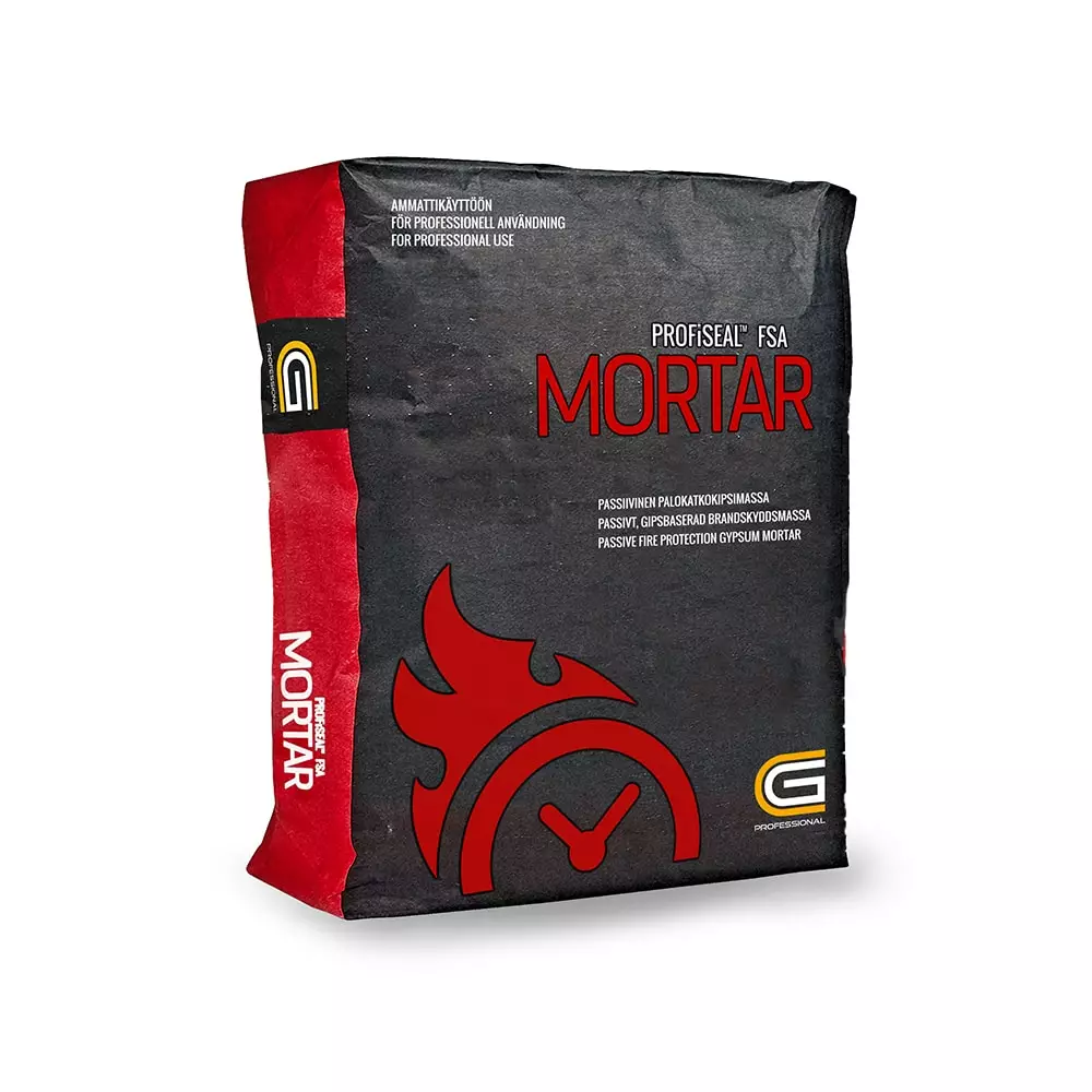 ETA-arvioitu ja CE-hyväksytty palokatkokipsilaasti, joka koostuu epäorgaanisista ainesosista ja perliitistä. Hyväksytty käytettäväksi palo-osastoivissa rakenteissa sähkökaapeli-, metalli- sekä komposiittiputki- ja yhdistelmäläpivientien tiivistämiseen rakennusten sisätiloissa. Veteen sekoitettaessa tuote muodostaa lämmöneristys- ominaisuuksiltaan erinomaisen palosulun ja estää palon sekä savun leviämisen paloluokiteltujen seinien ja lattioiden aukkojen lävitse. Palo ei pääse leviämään myöskään läpivientiaukkojen kautta. PROFiSEAL® FSA MORTAR säilyttää seinien ja lattioiden eristyskyvyn. Ei kutistu kuivuessaan, vaan laajenee noin 1 %, mikä takaa erittäin tiiviin palokatkon läpivienteihin ja aukkoihin. Kuivunutta laastia on helppo hioa ja porata. Tuote on kuivana lähes valkoista ja sen päälle voi maalata. Voidaan sekoittaa valulaastiksi tai jäykemmäksi, lastalevitteiseksi laastiksi. Kuivuneen massan tiheys on 900 kg/m3, jota voidaan hioa ja porata. Emicode EC1 Plus sisäilmaluokitus (erittäin alhaiset emissiot). Ääneneristävyys 64 dB (ISO 10140-2:2010). Lähes rajaton säilyvyys.