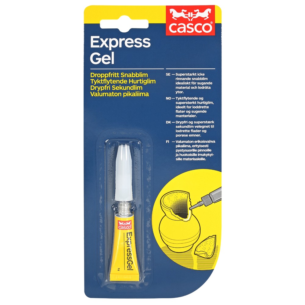 - Express Gel on erittäin vahva syanoakrylaattiliima huokoisten ja tiiviiden materiaalien liimaamiseen