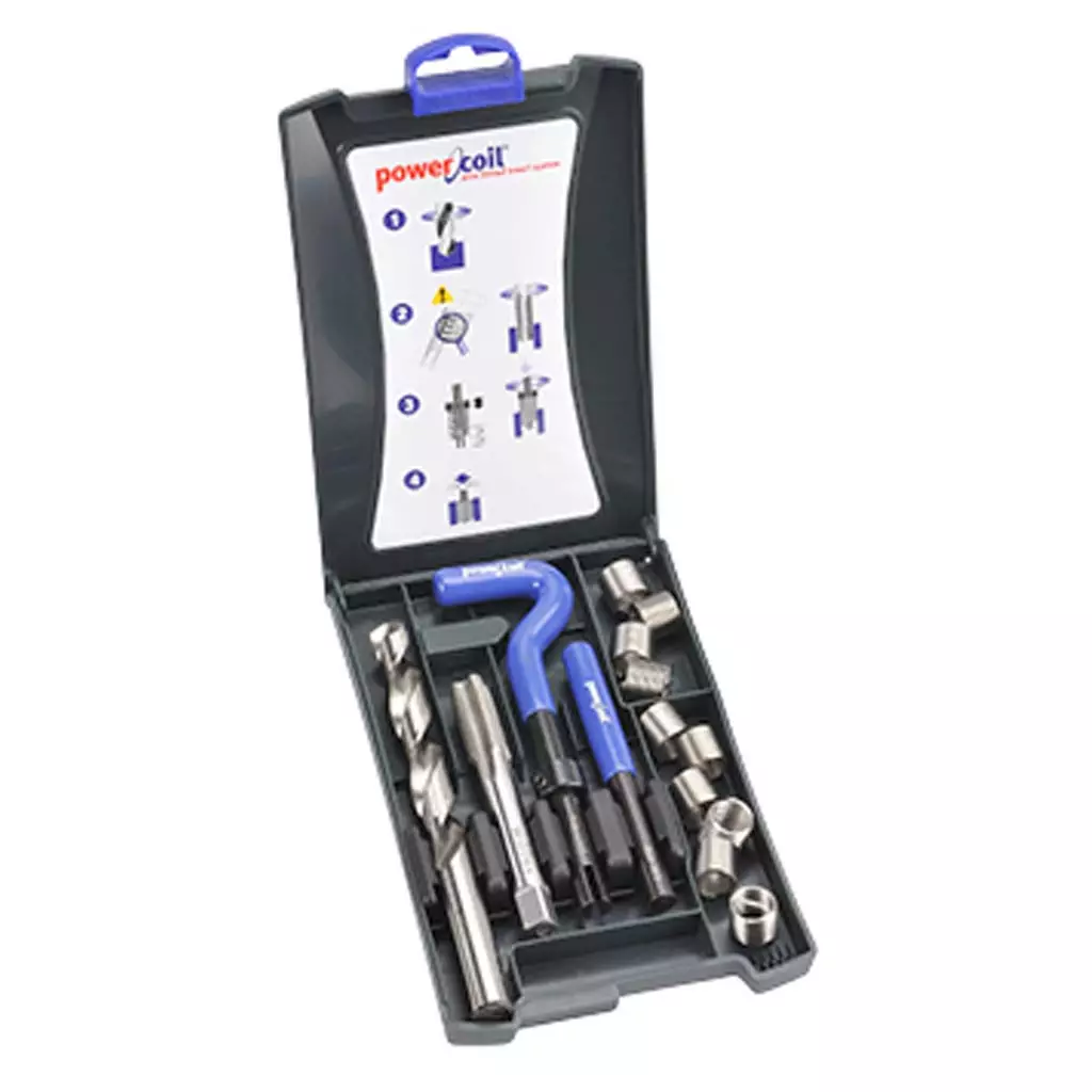POWERCOIL Kierteenkorjaussarja M14. Sarja sisältää kierretapin, asennustyökalun sekä kierreholkkeja. M14 x 2.0mm.
