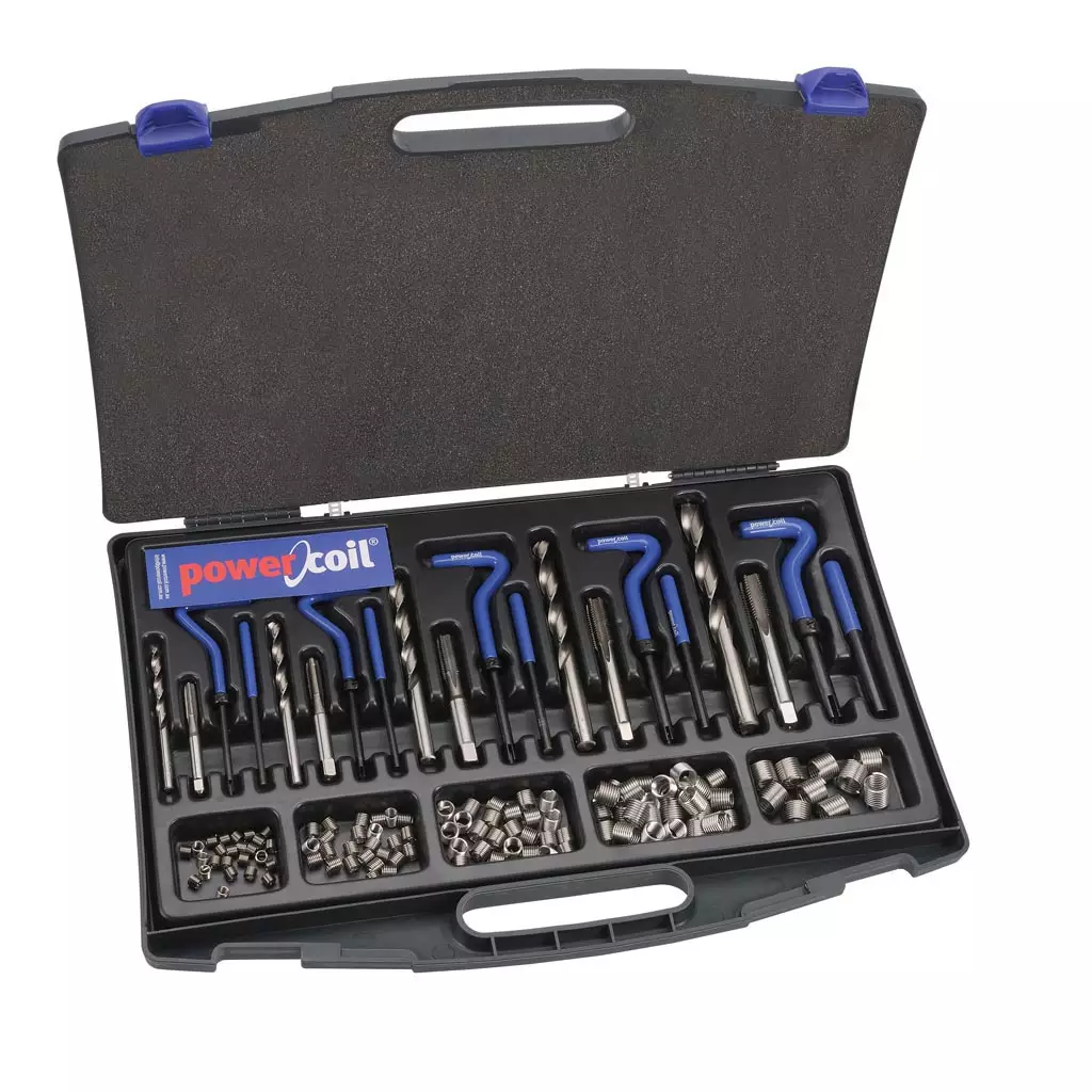 POWERCOIL Kierteenkorjaussarja UNC 1/4'' - 1/2''. Sarja sisältää kierretapin, asennustyökalun ja poranterän per koko sekä kierreholkkeja: 25kpl UNC 1/4" x 20, 25kpl UNC 5/16" x 18, 25kpl UNC 3/8" x 16, 10kpl UNC 7/16" x 14 ja 10 kpl UNC 1/2" x 13.