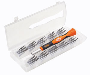 - 30 kpl ruuvauskärjet: Phillips: PH000 - PH00 - PH0 - PH1, Pozidriv: PZ0 - PZ1, talttapää: 1 - 1,5 - 2 - 2,5 - 3 - 3,5 - 4 mm, kuusiokolo: 0,7 - 0,9 - 1,3 - 1,5 - 2 - 2,5 - 3 - 4 mm, Torx: T4 - T5 - T6 - T7 - T8 - T9 - T10 - T15 - T20