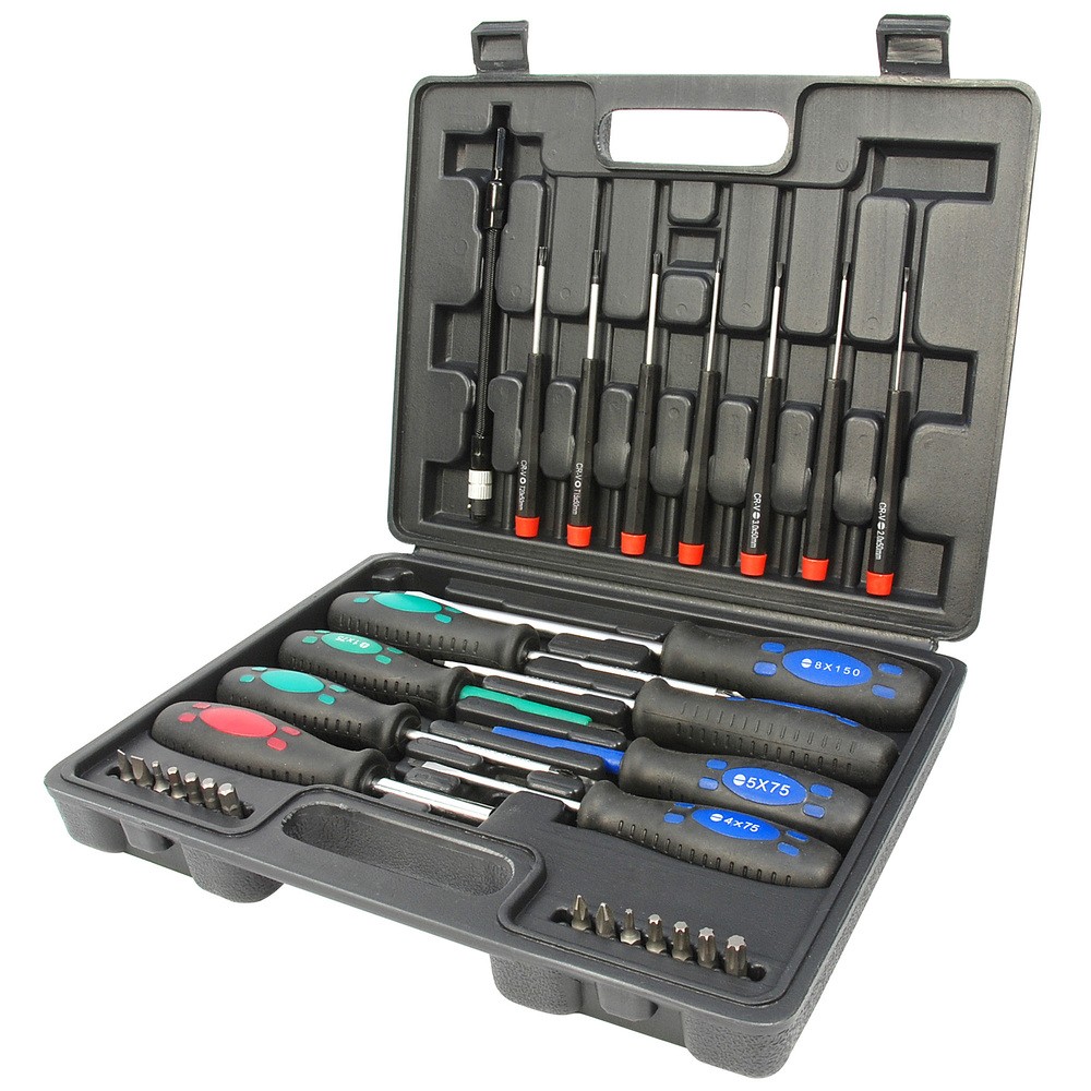 - ruuvauskärjet: talttapäät: 5 mm, 6 mm, Phillips: PH1, PH2, Torx: TX10, TX25, TX27, TX30, TX40, kuusiokolo: H3, H4, H5, H5,5, H6