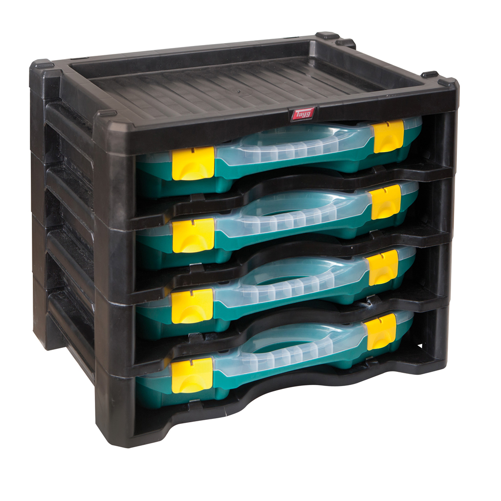 TAYG Muovilokerikkojärjestelmä MultiBox Nro 2. 4 muovilokerikkoa tukevassa ja pinottavassa kehikossa. Soveltuu erinomaisesti käytettäväksi esimerkiksi huoltoautoissa. Sisältää 4 x lokerikkoa... Lue lisää