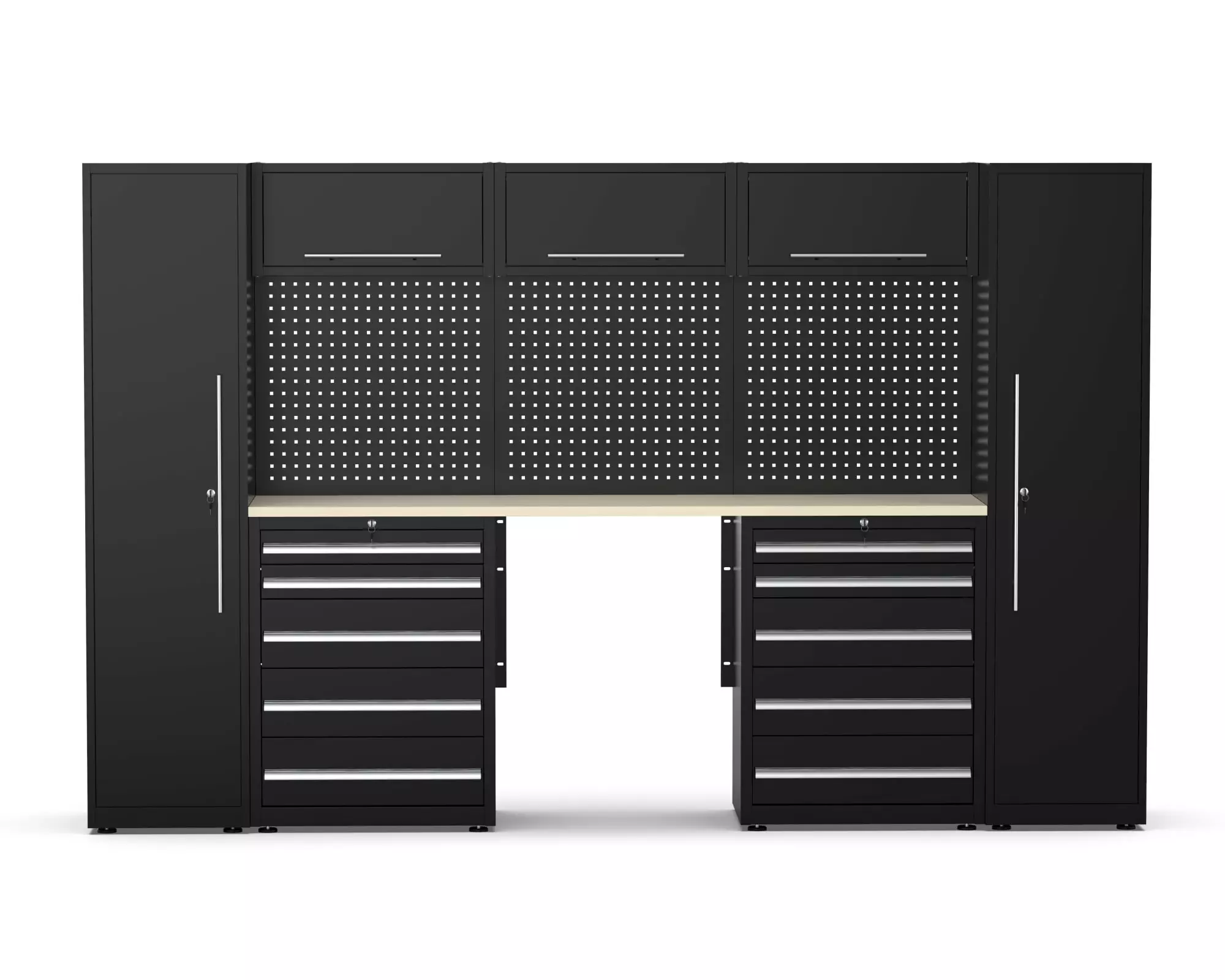 Elementteinä toimitettava, kestävällä rungolla ja kuulalaakeroiduilla laatikoilla varustettu kokonaisuus talleihin, verstaisiin ja varastoihin. Kahdella kapealla ja korkealla tarvikekaapeilla, kolmella pikkukaapilla ja kymmenellä vetolaatikolla varustettu kalusteryhmä. Pöydän runkomateriaali on pulverimaalattua terästä ja pöytätaso laminoitu puiseksi.