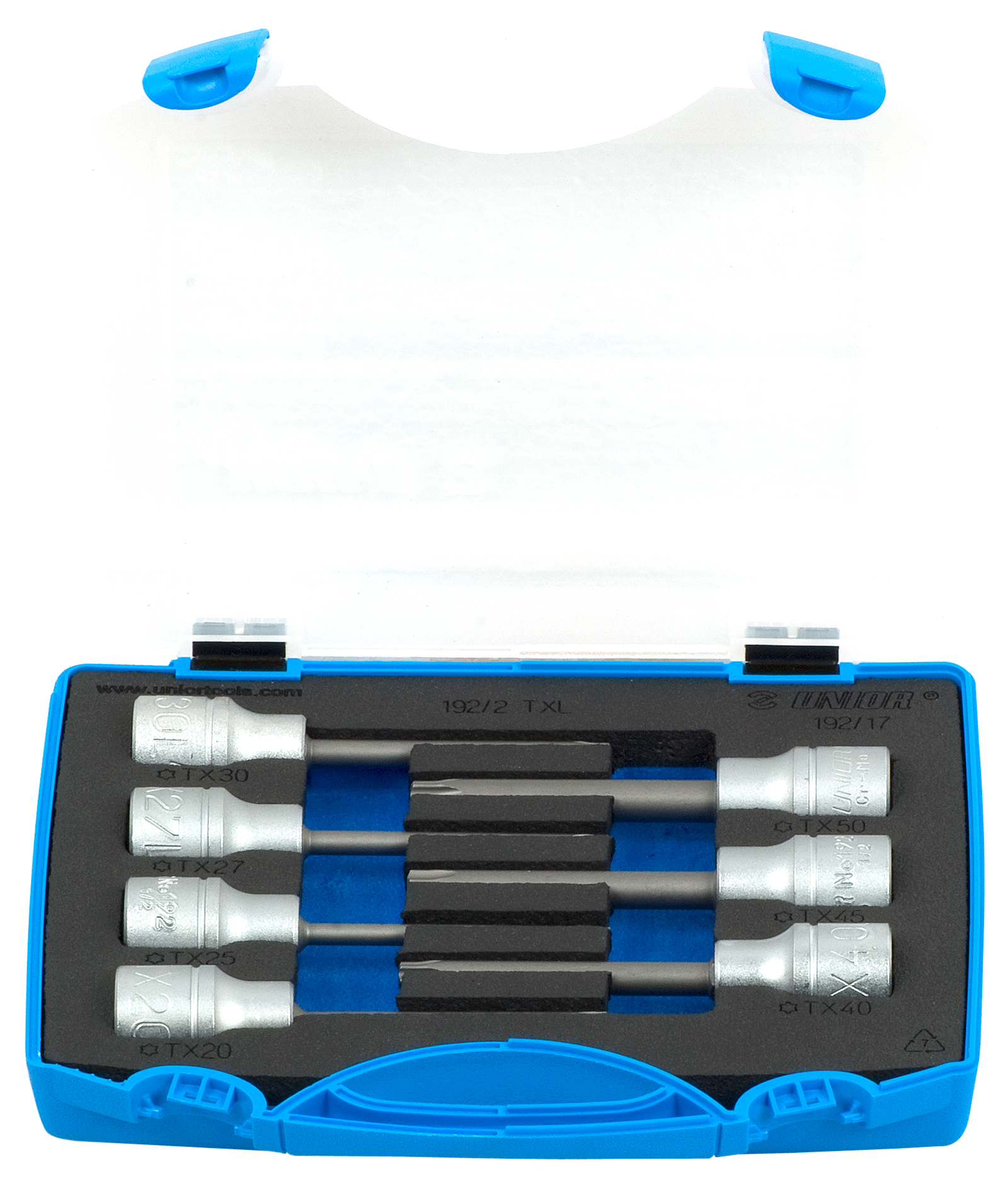 UNIOR 1/2'' TORX Hylsysarja 192/17, pitkät. Sisältää 7 osaa: TX-hylsyt 192/2TXL: TX20-TX25-TX27-TX30-TX40-TX45-TX50.