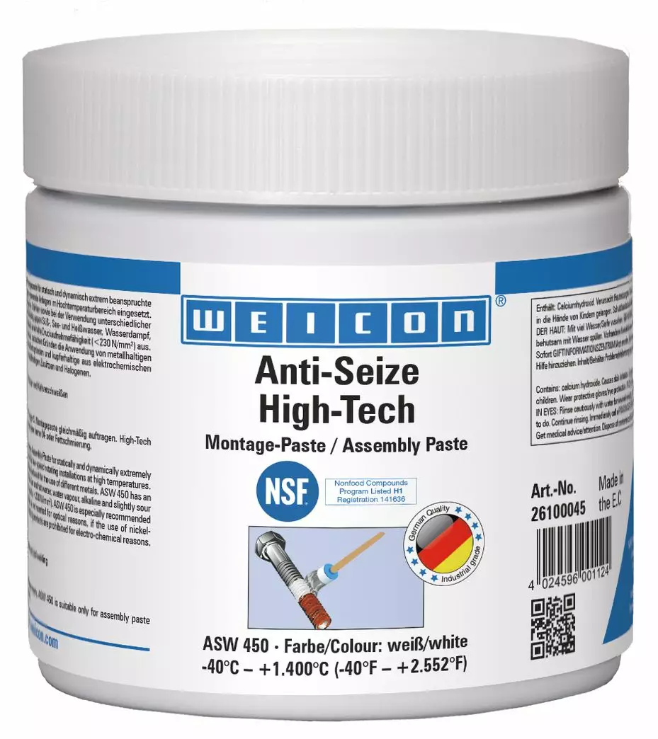 WEICON Anti Seize High-Tech -asennustahna kestää korkeita lämpötiloja, sillä on erinomaiset erotusominaisuudet, se on metalliton, materiaalineutraali ja sillä on NSF-rekisteröinti. Se sopii erityisesti tilanteisiin, joissa metallia sisältävät tahnat voivat aiheuttaa elektrolyyttisiä reaktioita, joissa nikkeliä sisältäviä tuotteita tulisi tai ei saa käyttää terveyssyistä ja joissa tummia metallia sisältäviä tuotteita tulisi tai ei saa käyttää visuaalisista syistä.