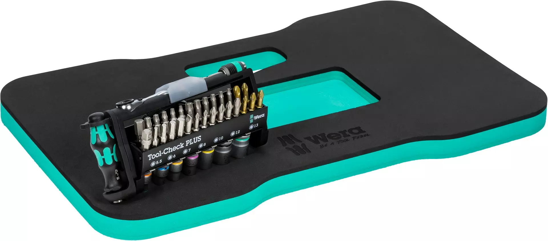 - Tool-Check PLUS: työkalulajitelma, johon kuuluu räikkä, Bits-kärkiä, hylsyjä ja ruuvitalttakahva kompaktiin tilaan pakattuna