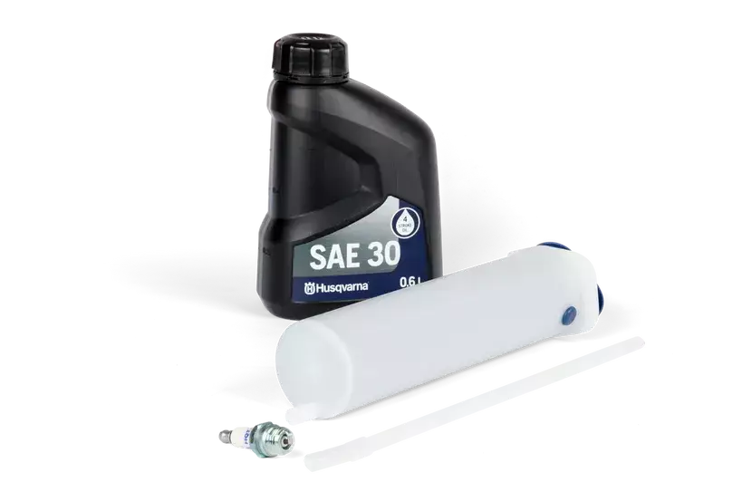 Husqvarna ruohonleikkurin huoltosarja - yleishuoltosarja Huoltosarja, jossa sytytystulppa, moottoriöljy ja imuruisku