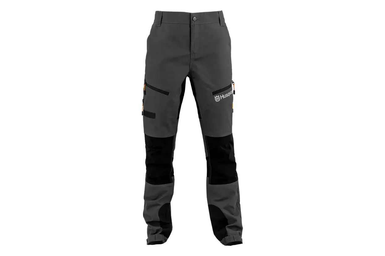 - Kestävyyden lisäämiseksi housut on vahvistettu kulutukselle erityisen alttiilla alueilla, ja niissä on reisitaskut sekä työkalunauha, jotta työkalut, käsineet jne. olisivat aina kätesi ulottuvilla.