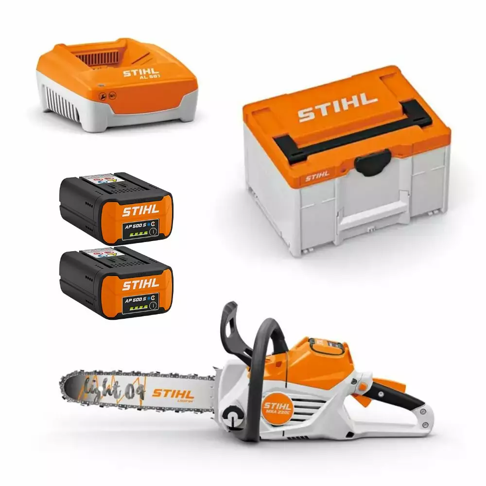 STIHL MSA 220 C-B Akkukäyttöinen moottorisaha kahdella AP500S akulla, yhdellä tehokkaalla AL 501 laturilla ja Stihl akkulaukulla.