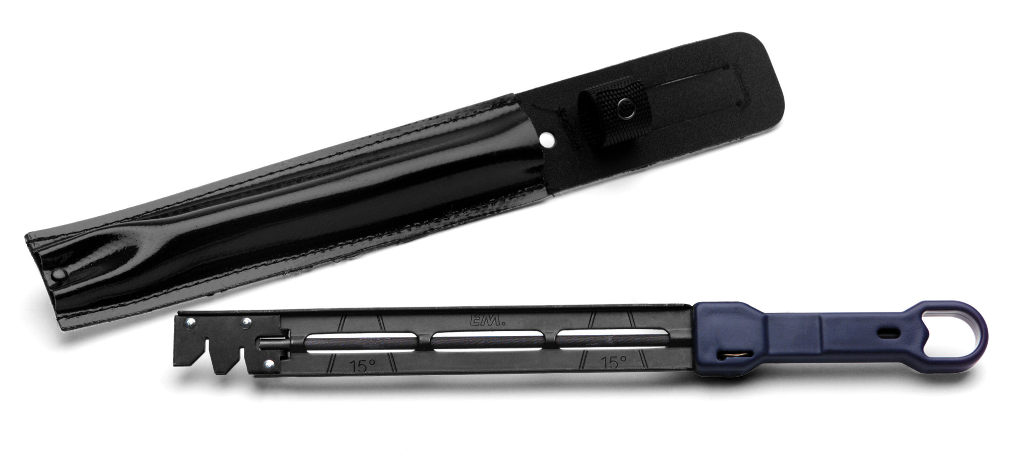 Viilanohjaimen avulla voidaan varmistaa raivausterän oikea viilaustekniikka ja -kulmat. Mukana viila.
