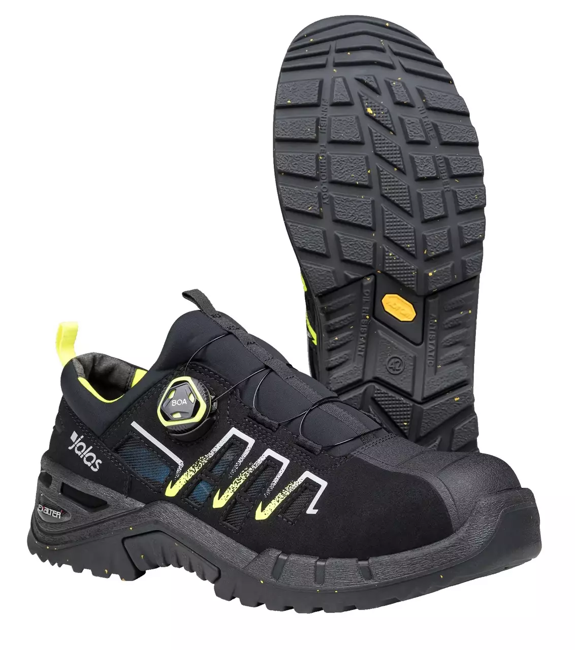 Suosittu Exalter-tuoteperhe on päivitetty vastuullisilla materiaaleilla, kestävyydestä, käyttömukavuudesta tai keveydestä tinkimättä. Turvajalkineiden päällinen on valmistettu kestävästä mikrokuidusta, josta 20 prosenttia on biopohjaista ja peräisin maissista. BOA®-kiinnitysjärjestelmä (kierrätysmateriaalista) sivulla eliminoi painepisteet ja verkkopäällysteiset tuuletusaukot tekevät jalkineesta hengittävän. Alumiininen varvassuoja, ja kierrätysmateriaalia sisältävä JALAS® EcoFlex tekstiilinaulaanastumissuoja. Pitoa parantava uusi Vibram® Ecostep-ulkopohja, joka on valmistettu 30-prosenttisesti kierrätetystä nitriilikumista.